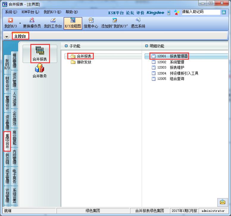 1、登录K3集团账套主控台的界面,依次单击[集团合并]→[合并报表]→[合并报表],双击[报表管理器];