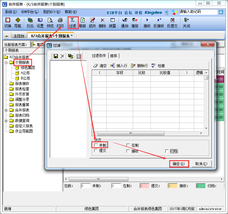 2、进入[报表管理器]界面,选择个别报表点击[过滤],勾选参数[未制],点击[确定];