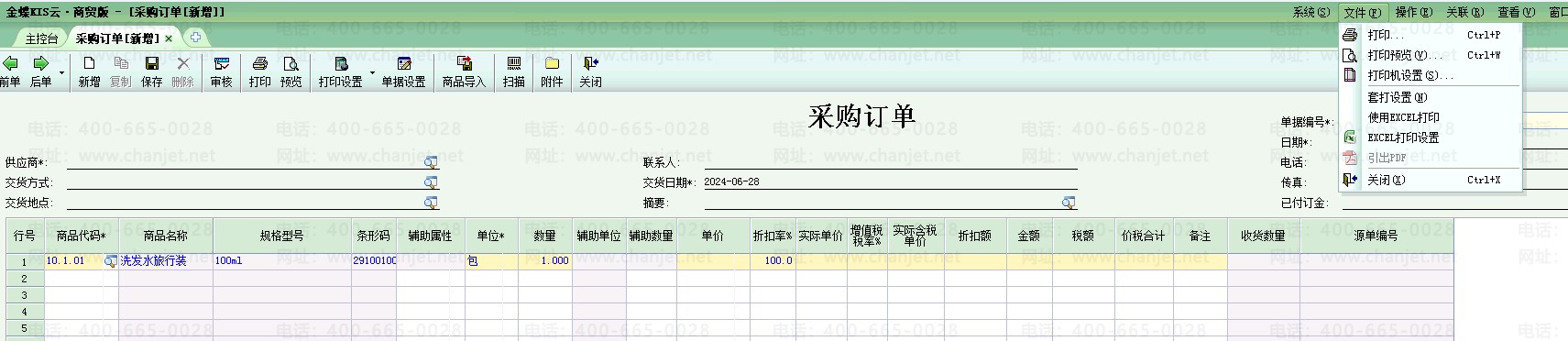 登录软件点击采购管理-采购订单-不勾选使用excel打印,此情况下默认为套打打印。