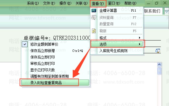 双击[其他入库单],单据新增界面右上角-[查看]-[选项]勾选参数录入时检查重复商品。