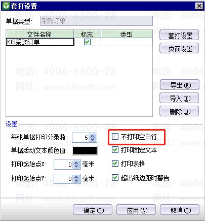单击[采购管理]-[购货单],单击右上角菜单栏[文件]-[套打设置],勾选[不打印空白行]即可。