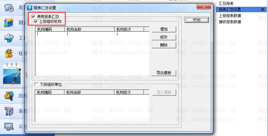 打开[报表汇总设置]-勾选[使用报表汇总]-添加上级组织机构。