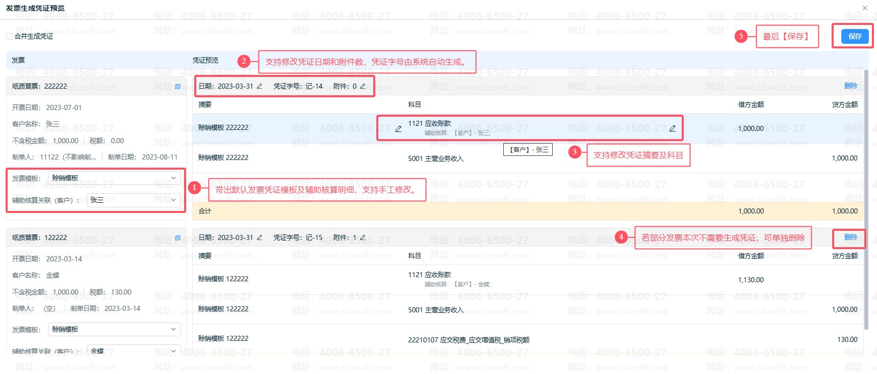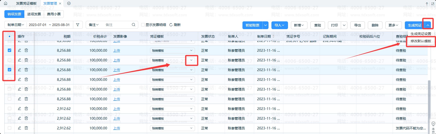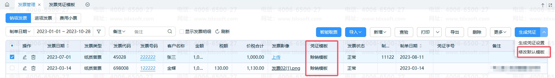 ②在发票列表可以查看带出的发票凭证模板,并支持修改。