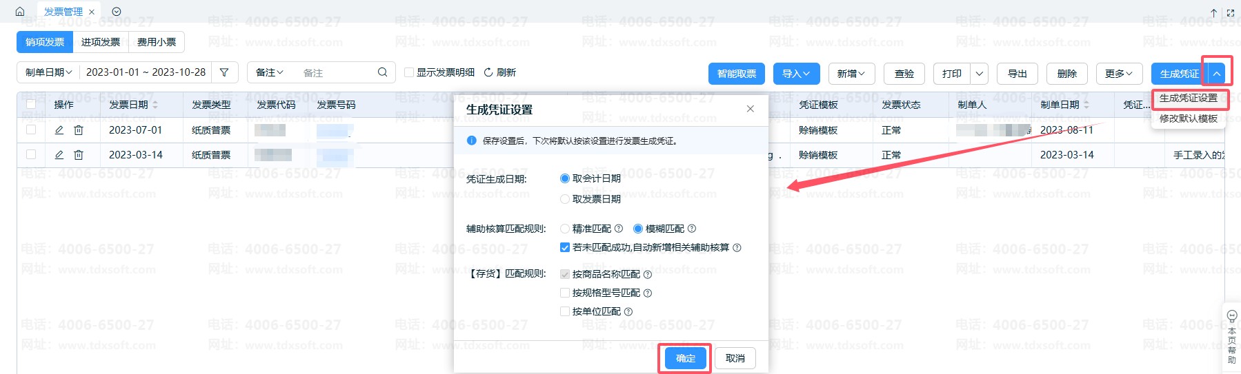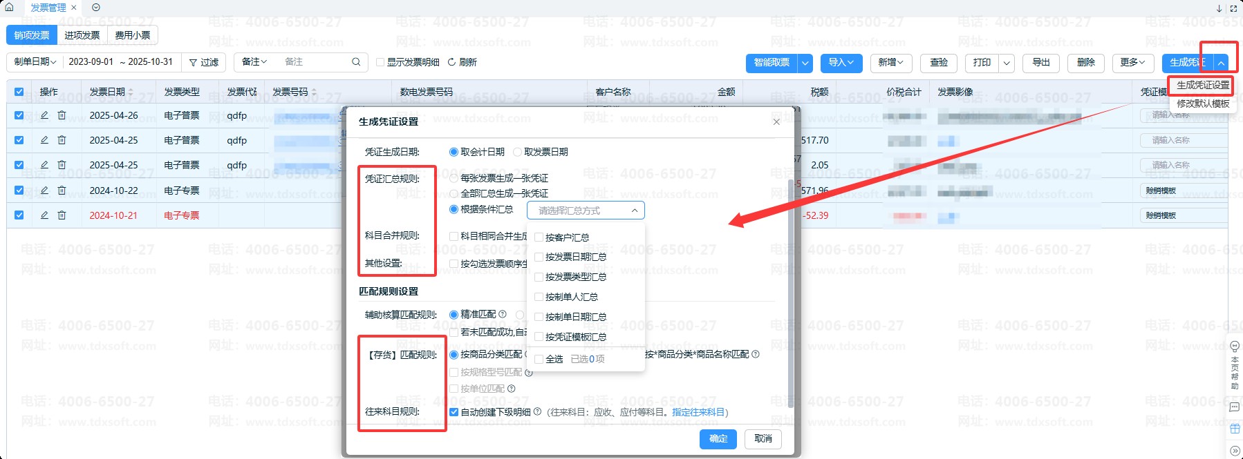 ①发票凭证模板可设置凭证字、摘要取数、科目取数和明细科目匹配规则等。