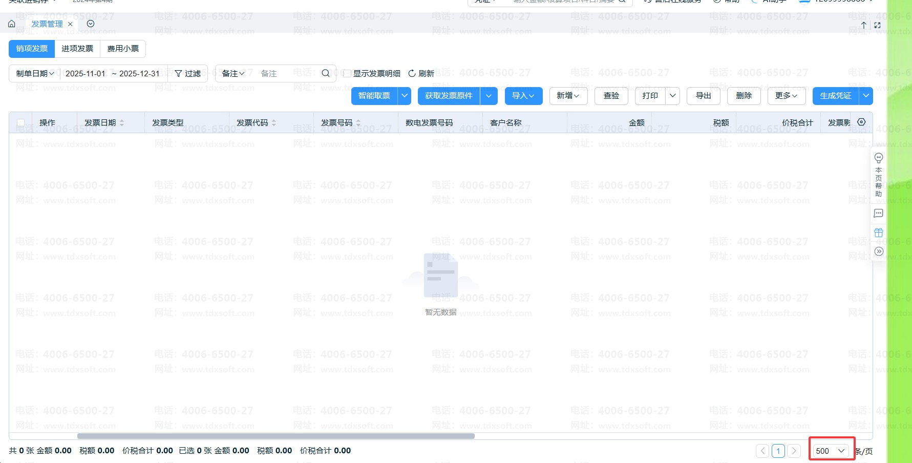 发票批量生成凭证时,因每页最多显示 500 条记录,若数据分多页展示,暂不支持跨页连续生成凭证。建议逐页操作生成,避免出现漏生成的情况。