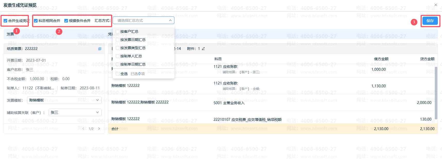 ①同时勾选多张发票生成凭证时,系统默认一张发票生成一笔凭证。