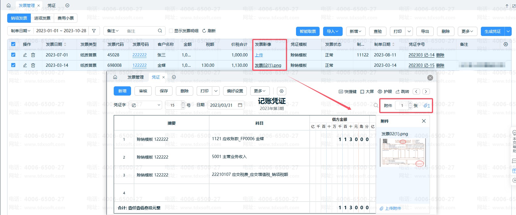 ③如果发票已上传或已获取发票影像,在生成凭证时自动生成凭证附件并显示对应附件数。附件数也支持手工编辑,但若没有发票影像则不会生成凭证附件。