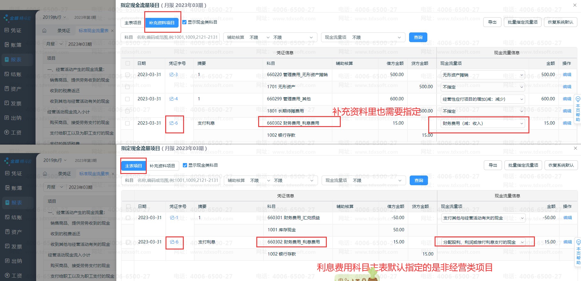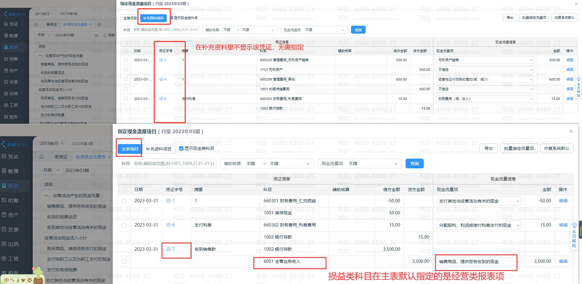 如图,损益类科目在主表指定的是经营类报表项,在补充资料无需指定:
