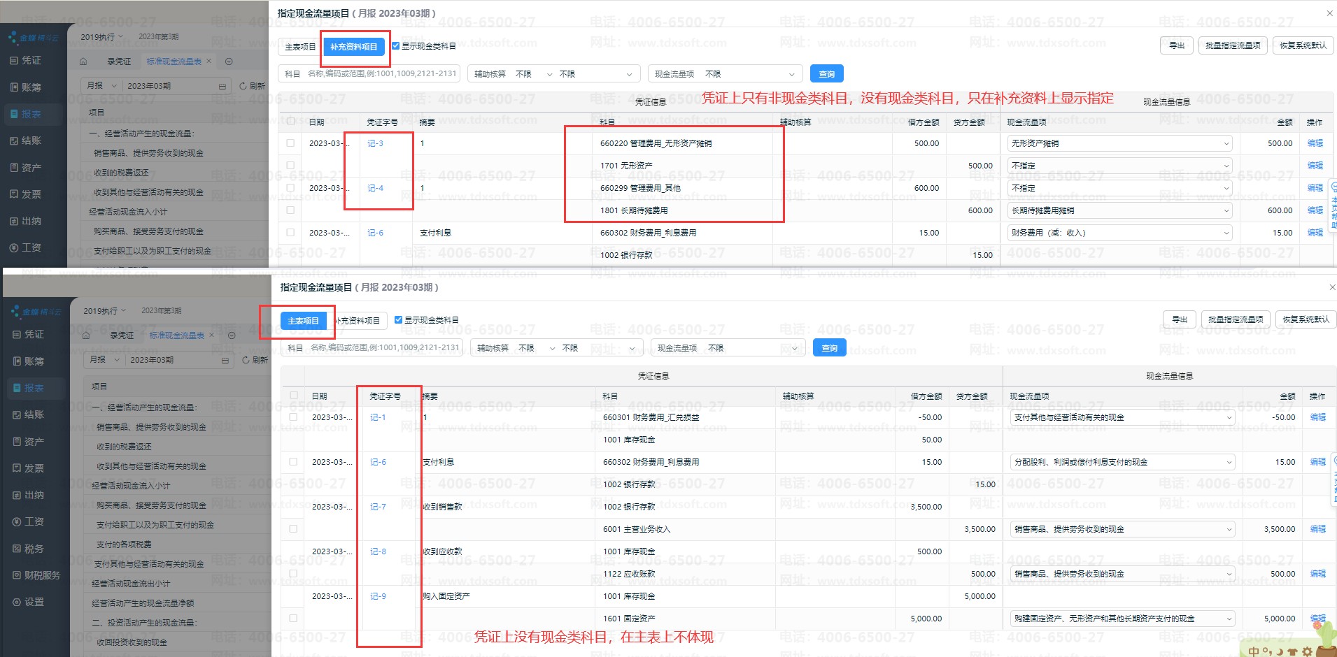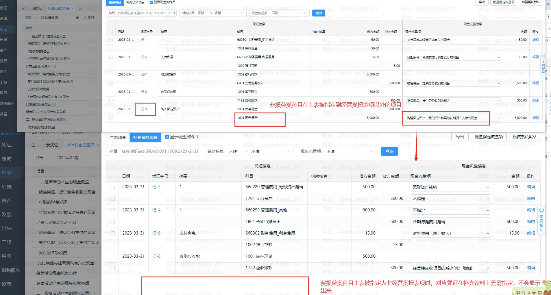 如图,非损益类科目在主表被指定为非经营类报表项上,在补充资料上无需指定