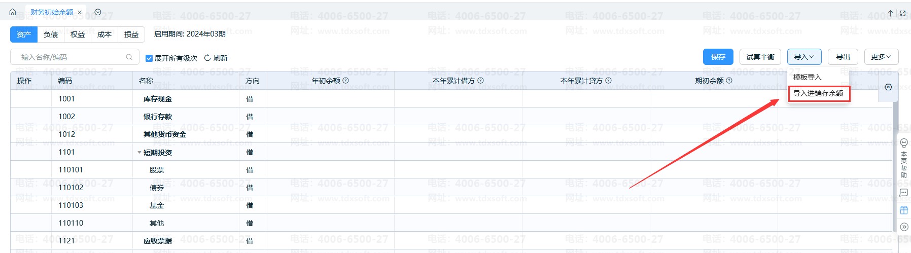 注:科目需设置辅助核算,如设置的明细科目,不支持批量导入明细的初始余额