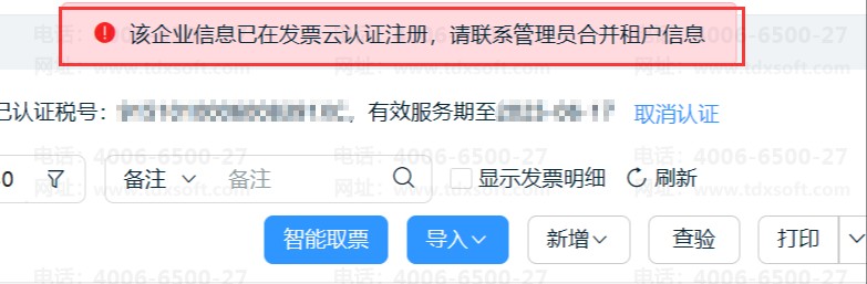 启用智能取票,进行企业认证时提示”该企业信息已在发票云认证注册,请联系管理员合并租户信息“