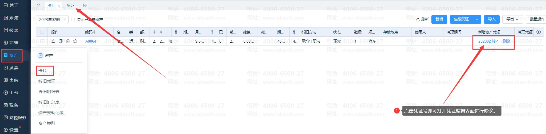 在资产卡片列表,由系统生成的购入/清理凭证,支持修改。可以修改凭证的任意内容,如摘要、科目及金额等。