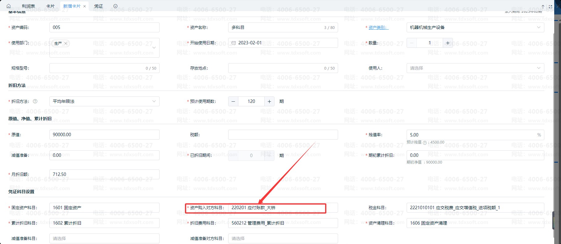 ②若是补录以前旧固定资产卡片,也需要填写“资产购入对方科目”不能为空,但系统不会生成购入凭证,不影响折旧数据。