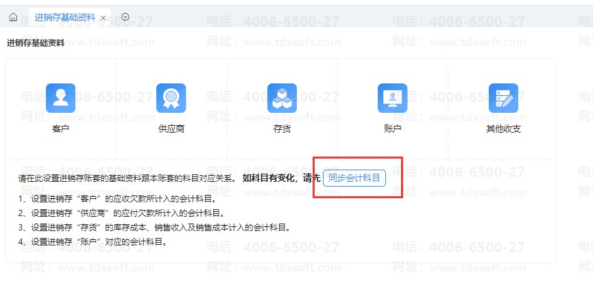 3、设置-进销存基础资料,点击【同步会计科目】