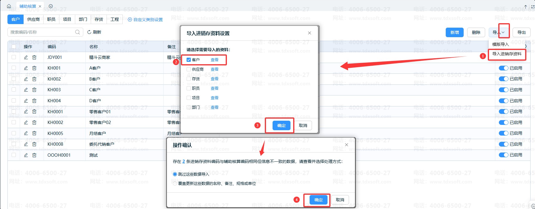 导入进销存资料的时候,若存在有进销存资料编码与辅助核算编码相同但信息不一致的数据,可以查看并选择对应的处理方式,若选择覆盖更新这些数据的名称、备注、规格或单位,建议先备份一下账套再操作。