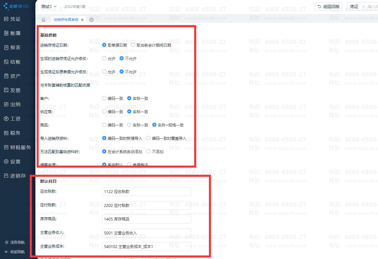 点击【设置】-【进销存核算参数】,设置好科目对应的参数与默认科目