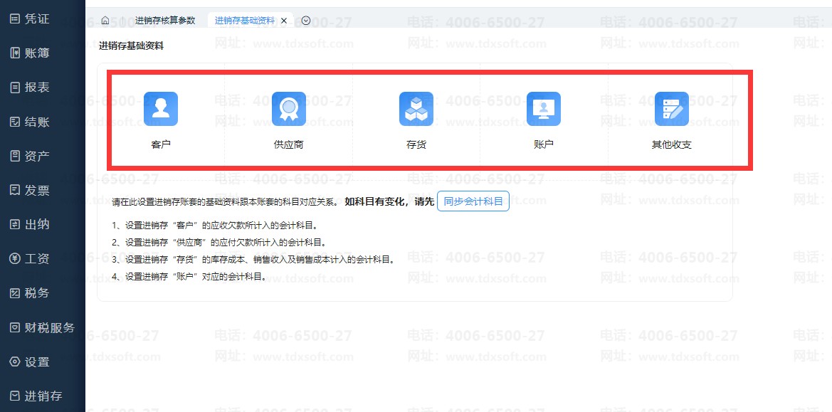 设置好对应科目后,返回【进销存基础资料】界面,点击【同步会计科目】