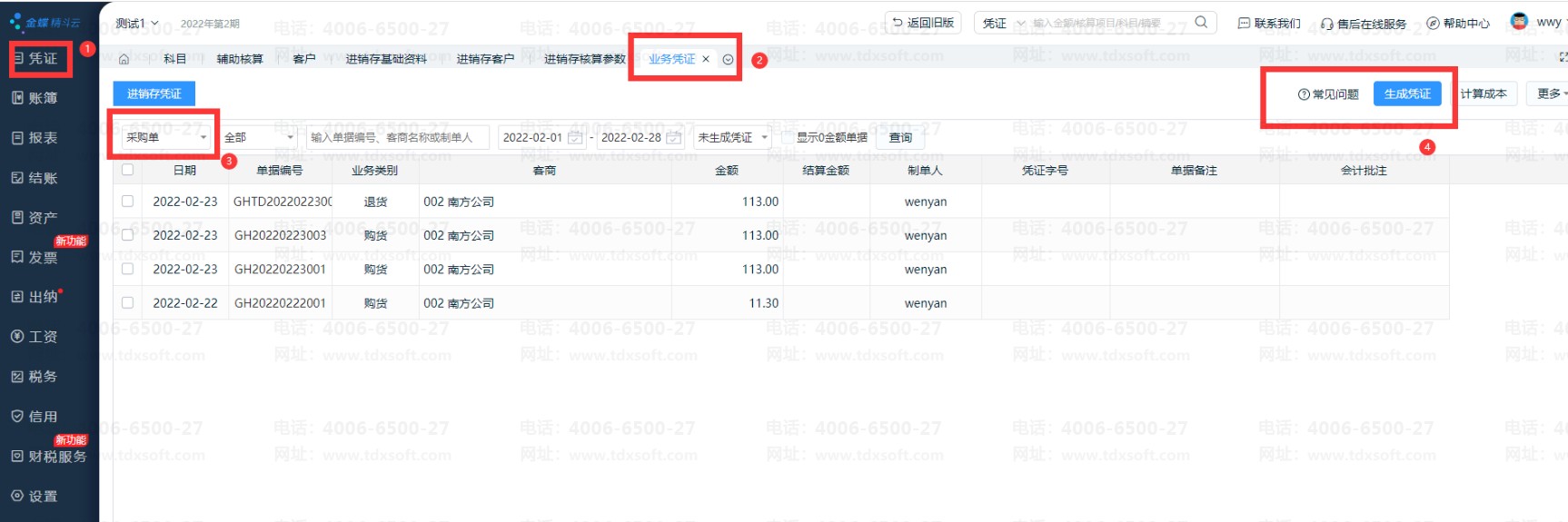 设置好后,点击[凭证]-[业务凭证]-[进销存凭证],根据业务单据类型,生成凭证