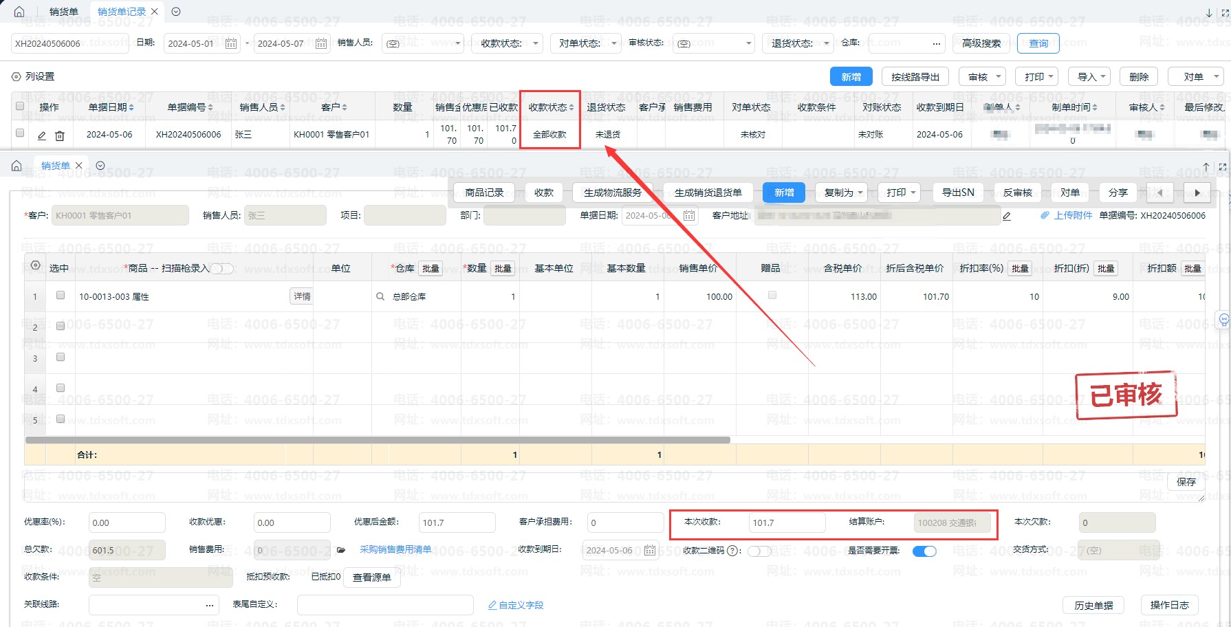 1、若销售同时收款,直接在销售单下方的【本次收款】、【结算账户】录入收款账户和金额,则销售单状态为【全部收款】状态。不需要另外录入收款单。
