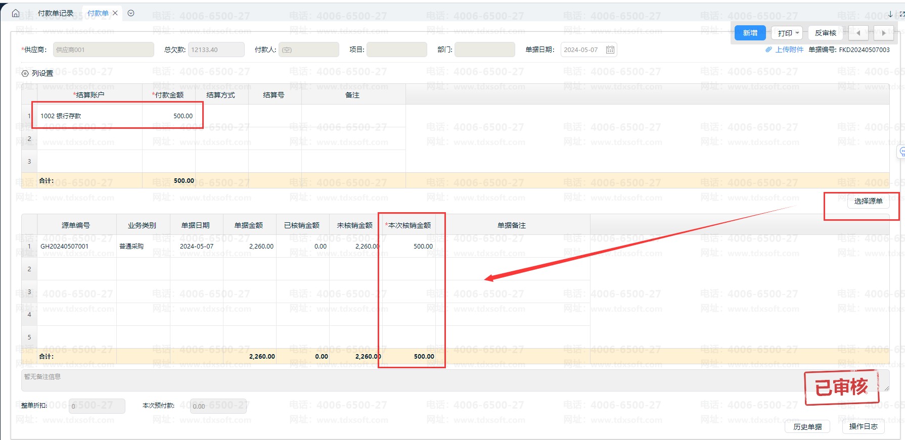 2、若采购时没有付款,保存/审核购货单后直接生成应付账款。后续可通过在【资金】-【付款单】-【选择原单】进行核销核销,冲抵应付账款。