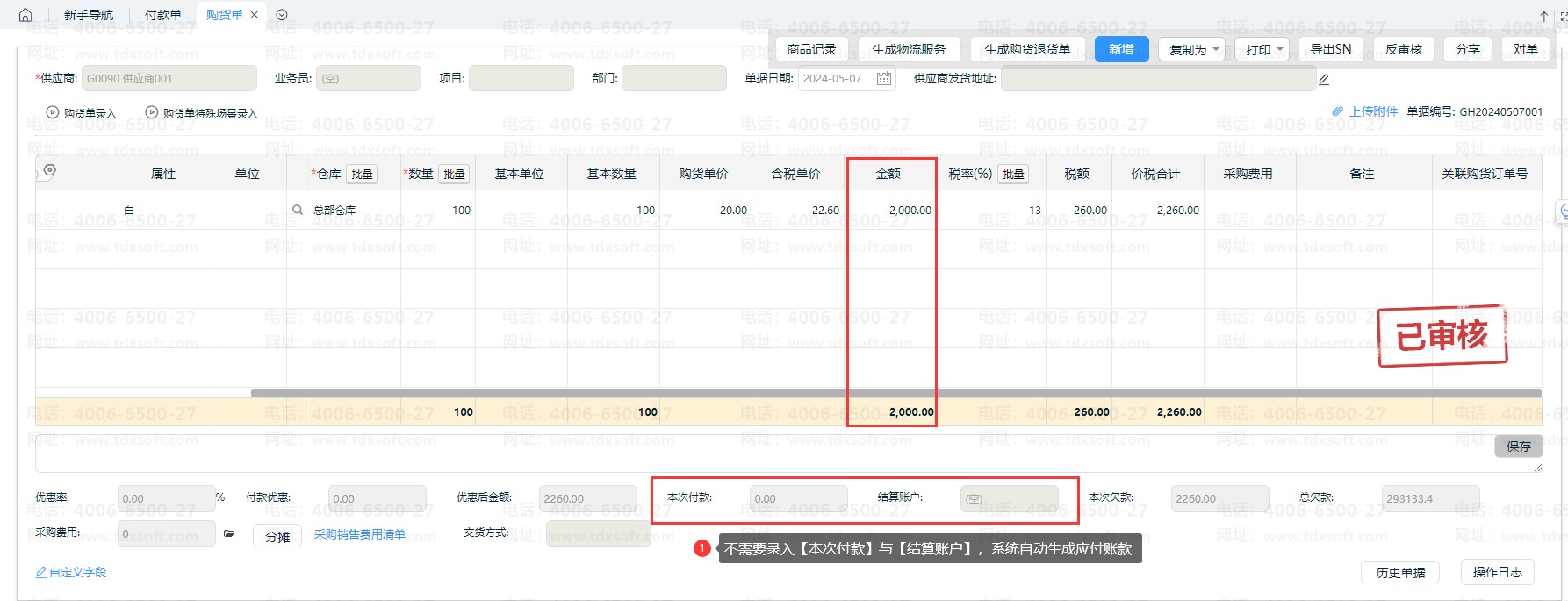 2、购货入库:购货单,不填本次付款、结算账户,系统自动挂应付款