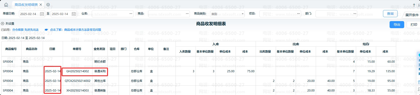 可在【仓库】-【商品收发明细表】商品的出入库明细、出入库成本、结存数量及成本等明细。