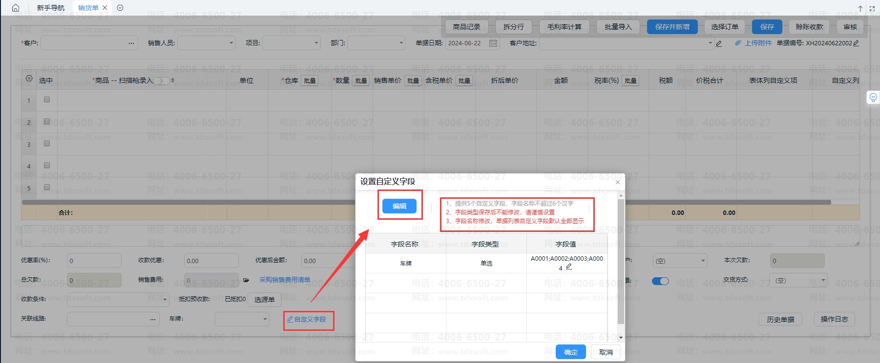 1、以销货单为例,点击【自定义字段】,然后点击【编辑】