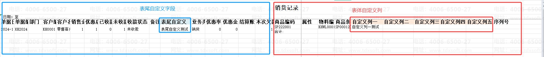 自定义字段均支持导出,在单据记录导出单据时,可同时导出表尾自定义字段和自定义列的内容。以销货单为例: