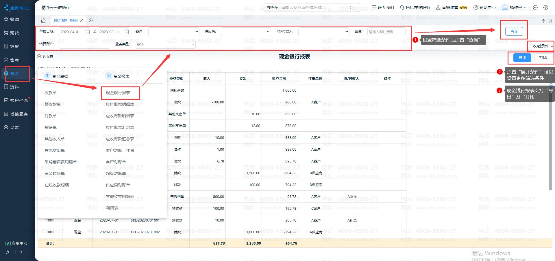 现金银行报表:用于查询各银行账户及现金的收入、支出及结余情况,可以按客户、供应商、结算账户、收付款人等条件查询。可查询一定期间内,各个账户金额收支以及结余金额的来龙去脉。