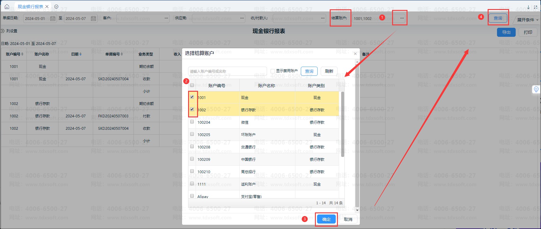 说明:支持同时选择多个账户查询,或是指定某个账户查询;若结算账户为空,则默认查询所有账户的明细。