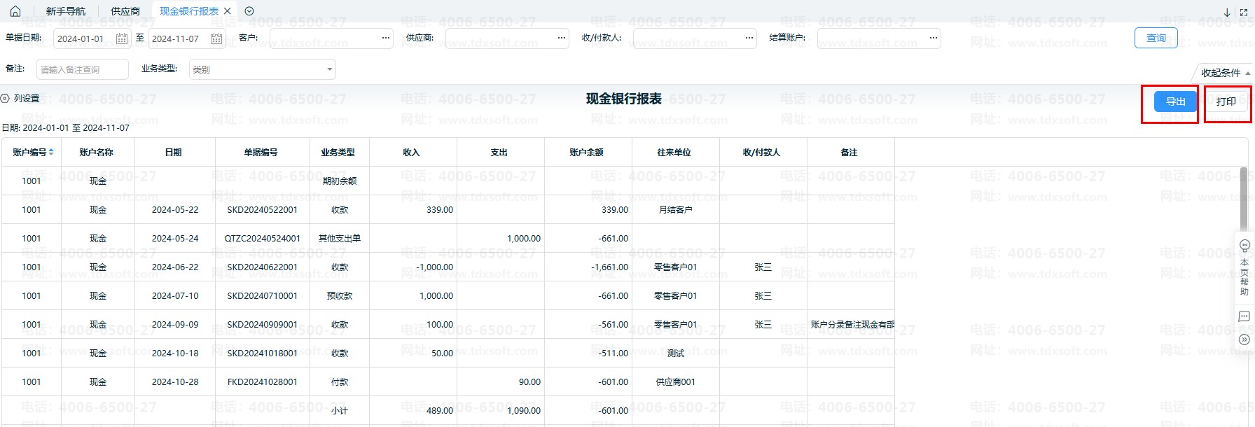 3、现金银行报表也支持导出及打印,直接点击右上角【导出】、【打印】按钮即可。