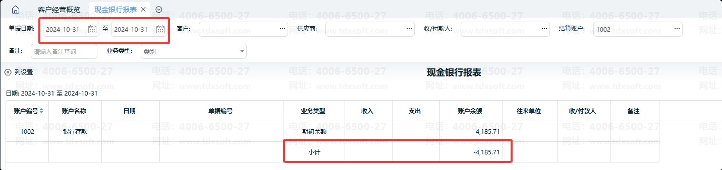 例如:若当前查询的 “开始日期” 为2024年11月01日,那么 “银行存款” 账户的期初余额,就是2024年10月31日该账户的结余金额。