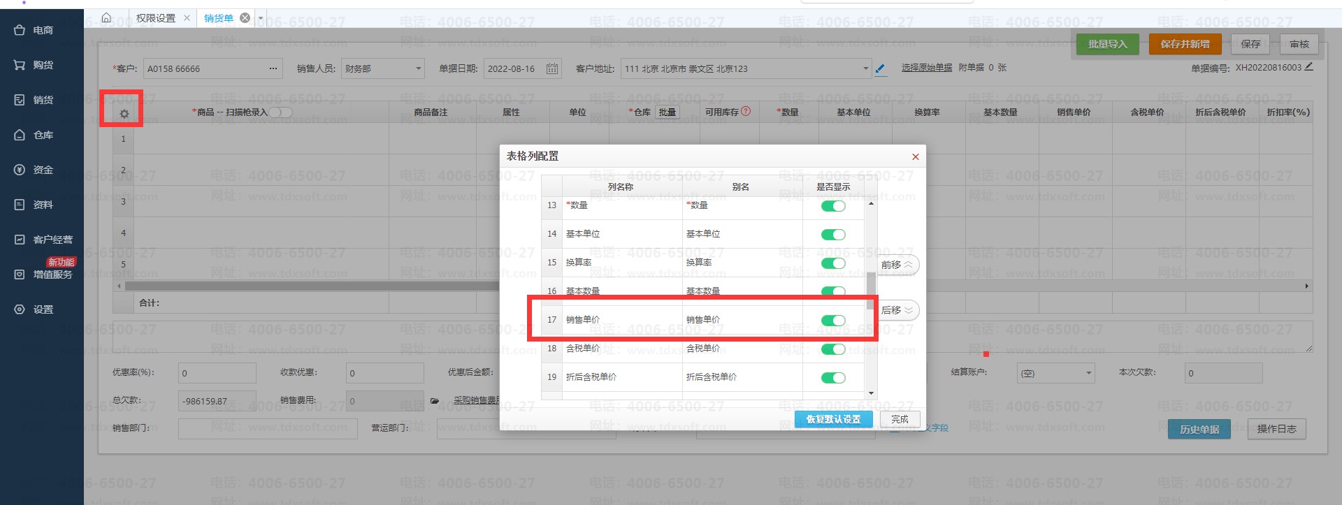 3、若已授权,单据仍是不显示金额字段,可检查单据列设置,是否隐藏金额字段。如图所示: