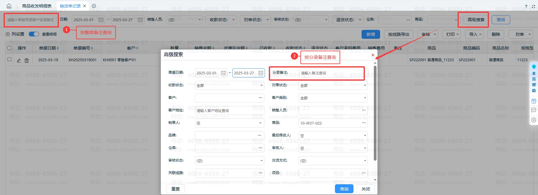 ④在单据记录(单据列表)所有单据类型支持按整单备注和分录备注搜索查询。