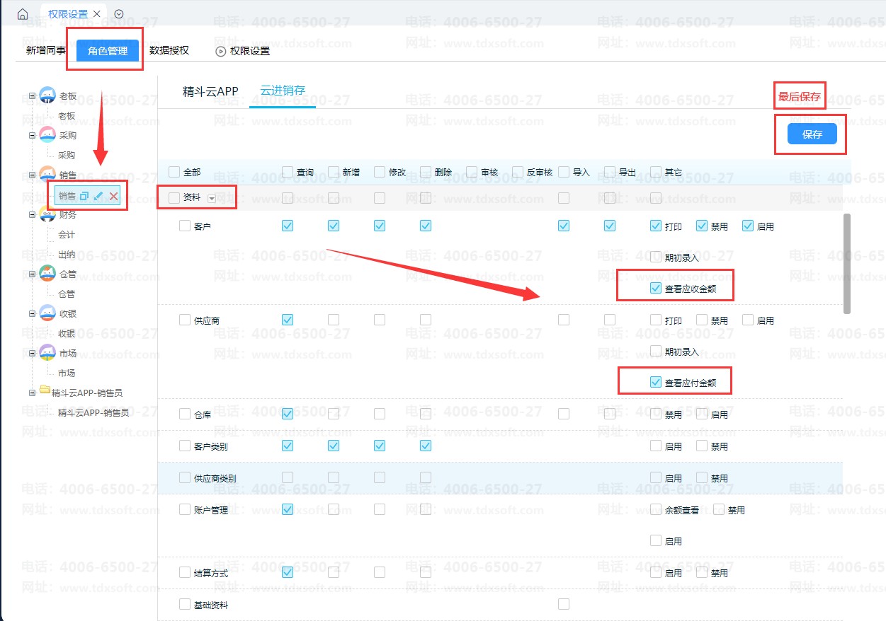 角色管理中授权时,左边要选择对应的角色,然后在右边勾选【查看应收金额】、【查看应付余额】的权限项。