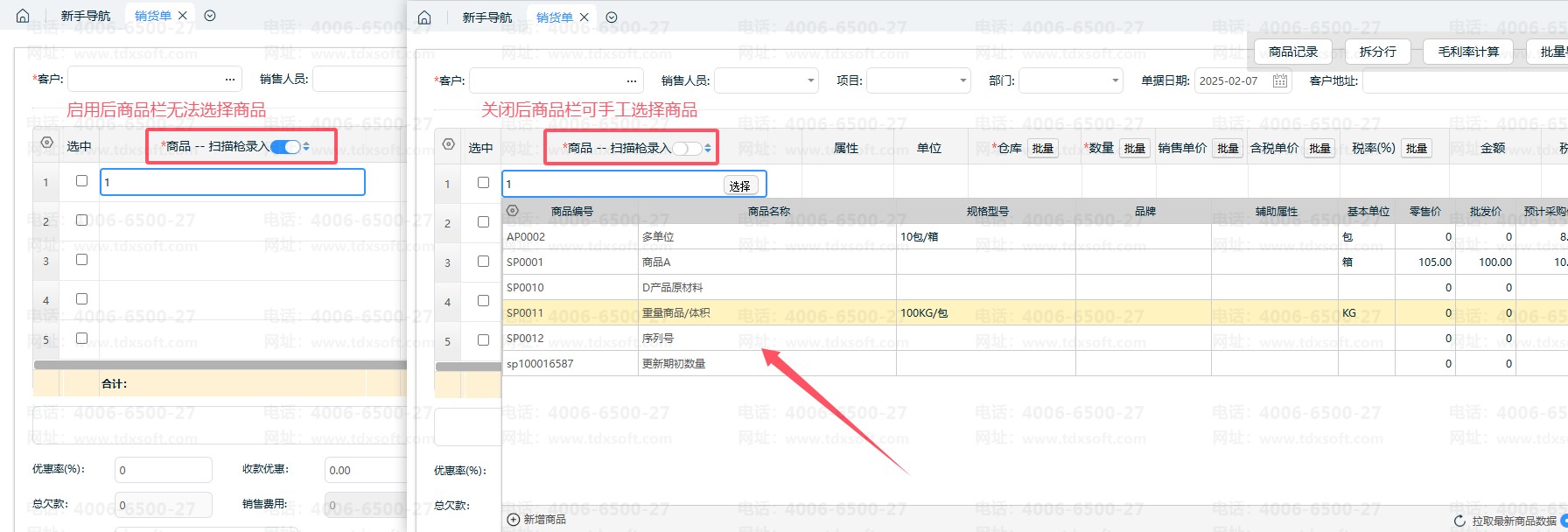②启用【商品-扫码枪录入】功能后,商品栏无法输入商品信息模糊查询带出商品。