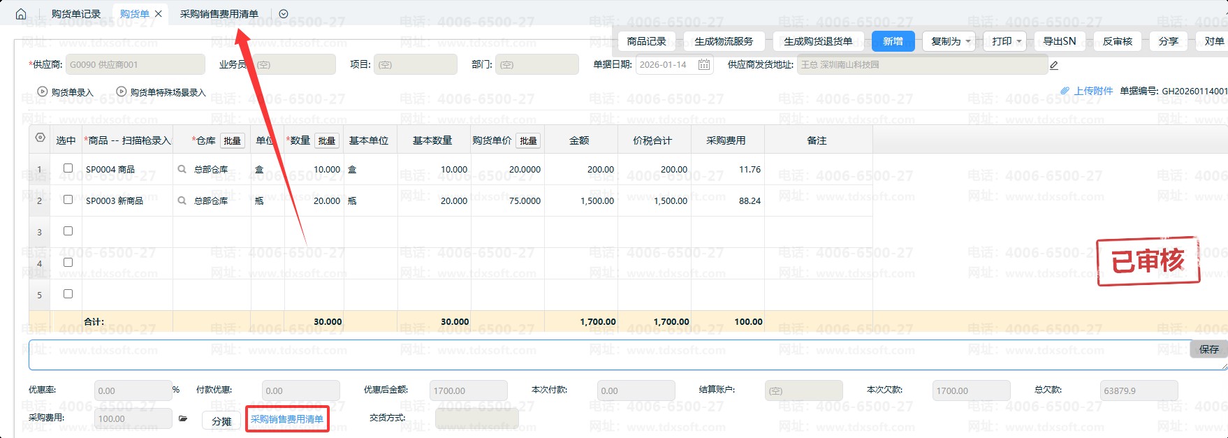 1、若采购费用不需要分摊,仅做为费用记录,按“方式一”录入采购费用明细后,不要点击【分摊】按钮,则表体中商品分录不会显示“采购费用”。