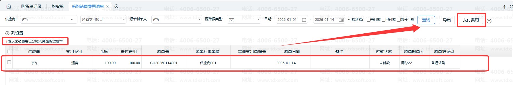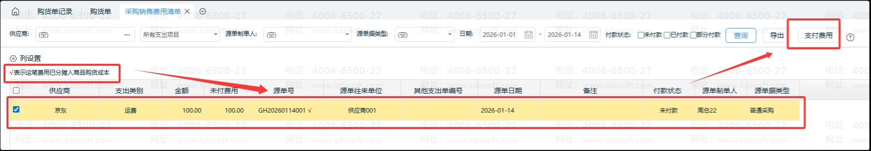 注意:已分摊的采购费用,在“源单号”中会显示√图标。