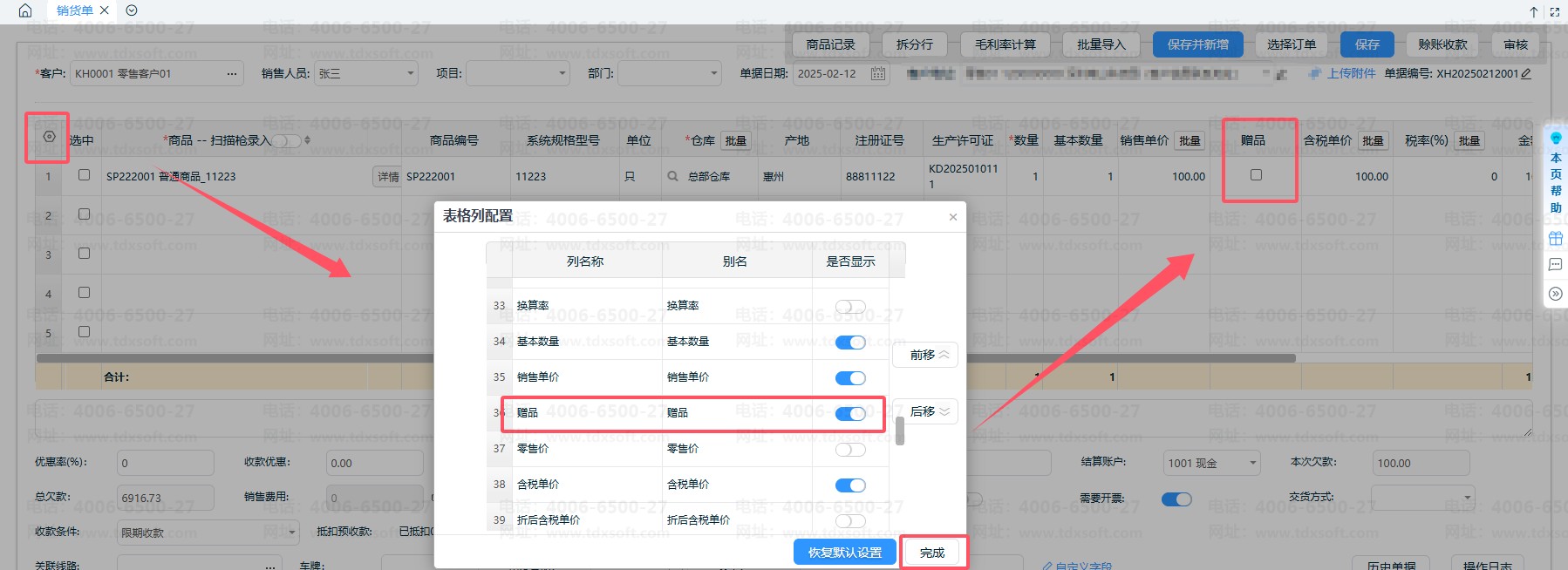 接着选择赠品,勾选赠品选项。涉及到金额栏目默认为0,且无法编辑修改。
