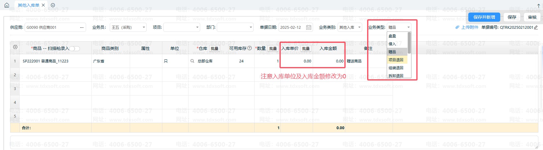 新增其他入库单,业务类型选择【赠品】,注意入库单价及入库金额修改为0。