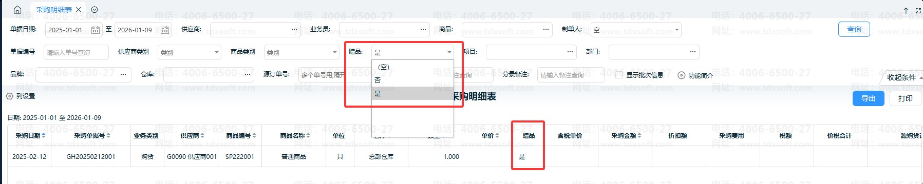 后续可通过【购货】-【采购明细表】,按“赠品”筛选条件统计赠送商品数据。