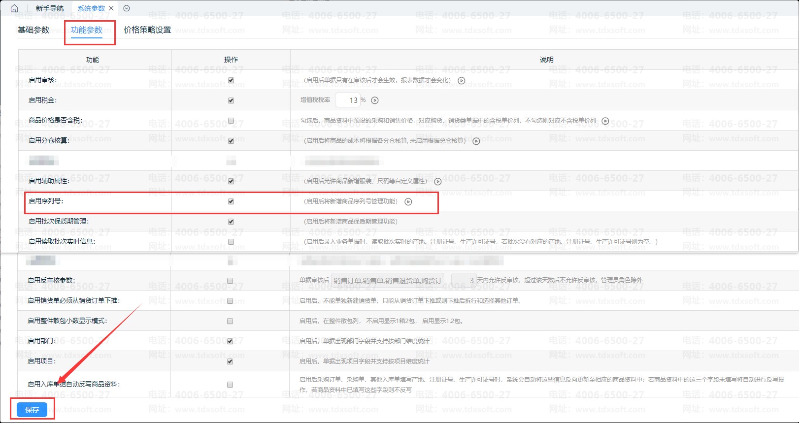 1、 在左下角【设置】-【系统参数】-【功能参数】,勾选“启用商品序列号管理”
