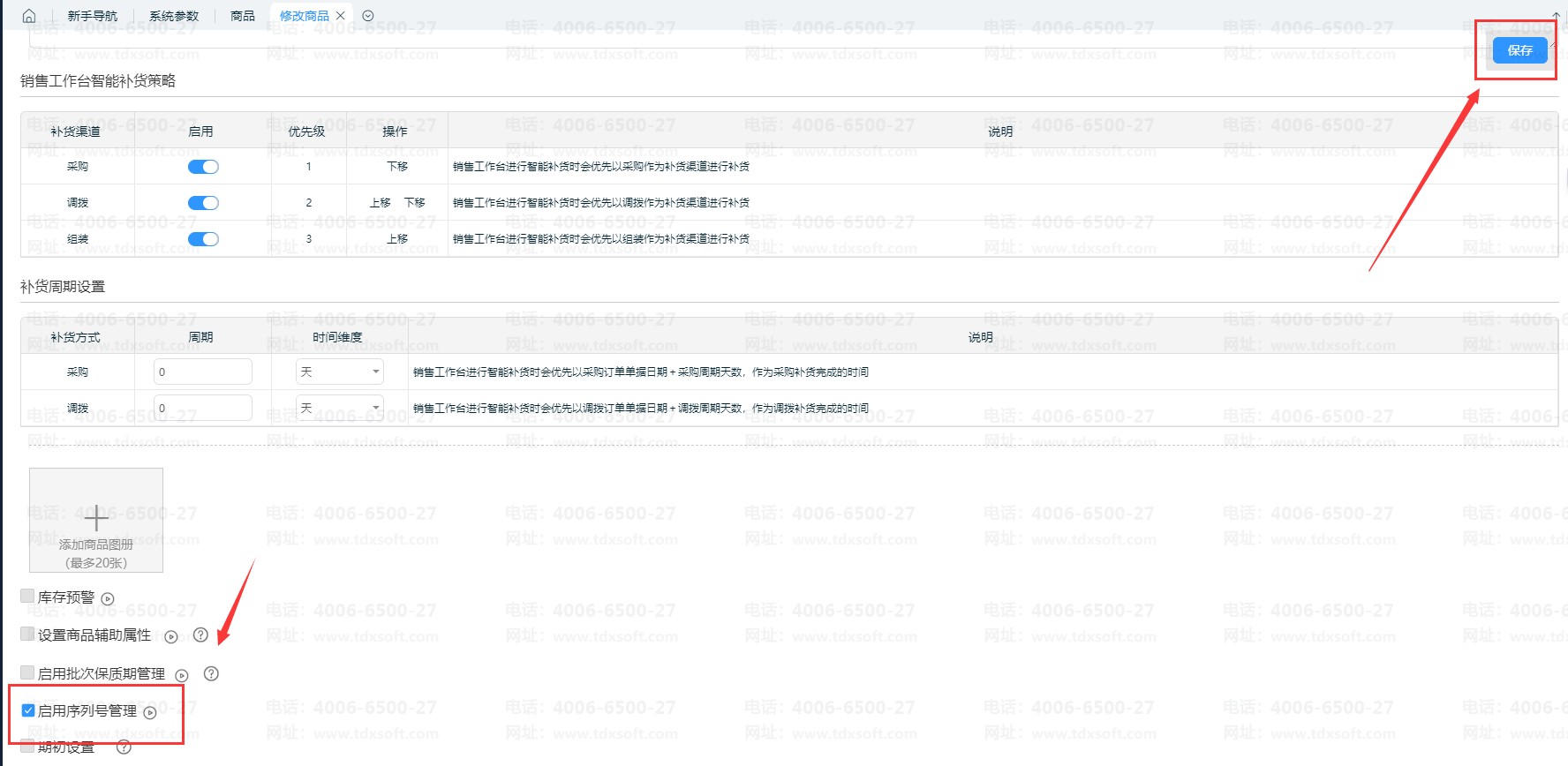 2、在【商品】-【商品】中新增或编辑商品,勾选“启用序列号管理”