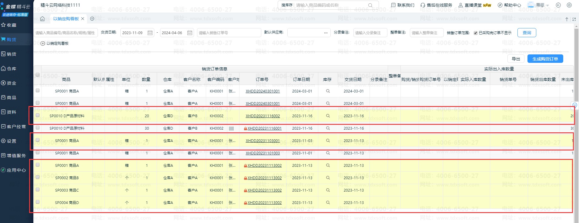如图所示,销货订单XHDD20231113002有四种商品,以黄色底色与上一个订单区分;并且勾选其中一笔分录后,会以橙色底色突出显示。