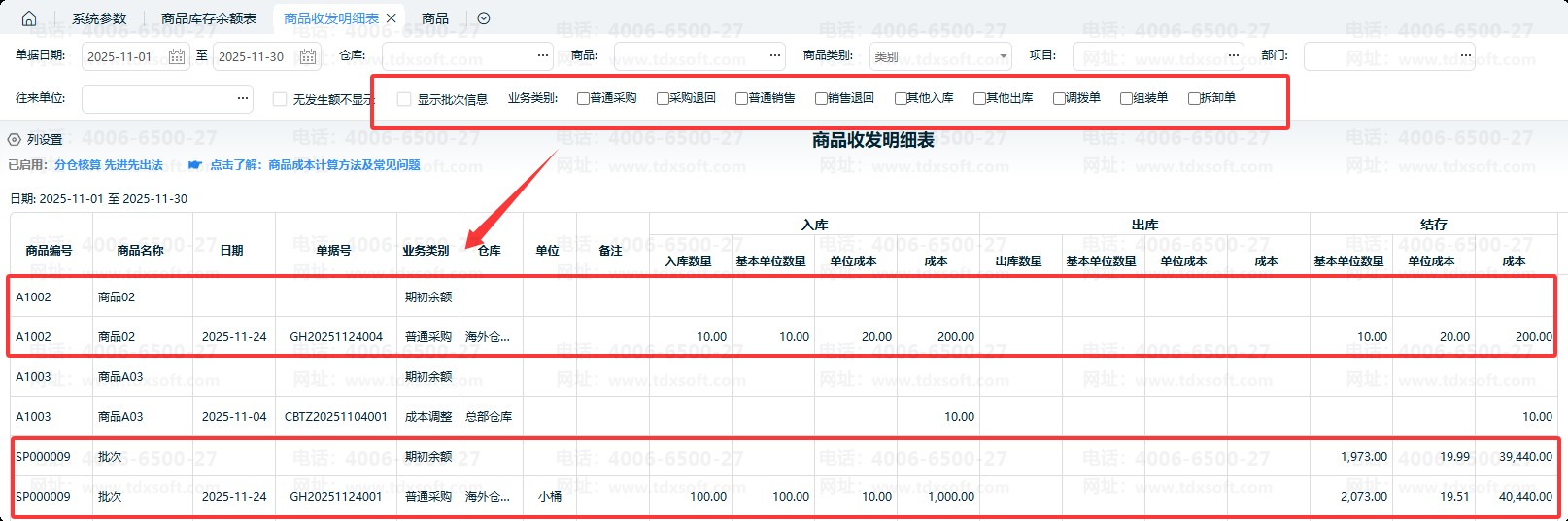 ⑦同时可以按“业务类别”筛选查询。注意:业务类别中的“期初余额”为系统默认自动带出的选项,不支持筛选剔除;该选项对应的是截止 “单据日期” 起始日之前的商品结存数。