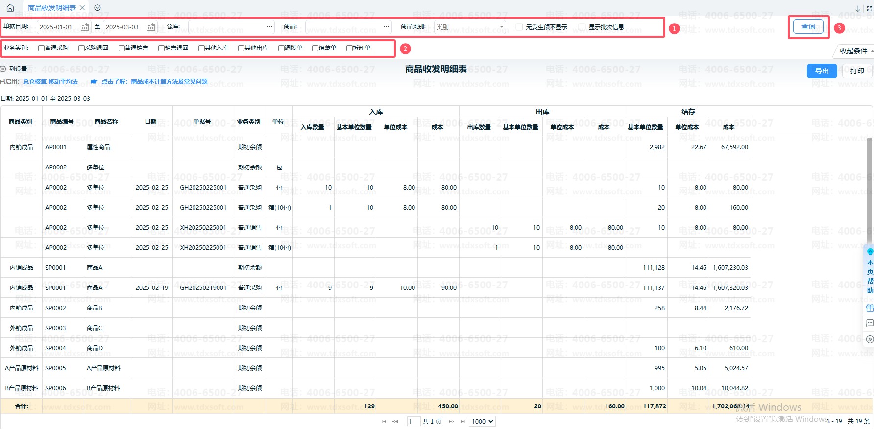 ⑤查询时间范围内,未发生出入库业务的商品不显示,可勾选“无发生额不显示”;