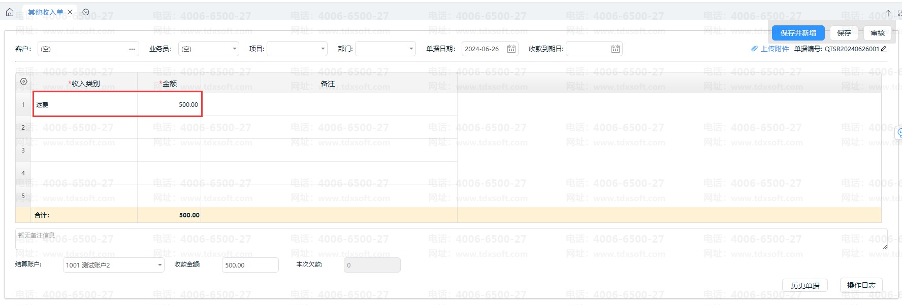 说明:其他收入单与其他支出单暂不涉及税率相关设置,不支持录入税额。