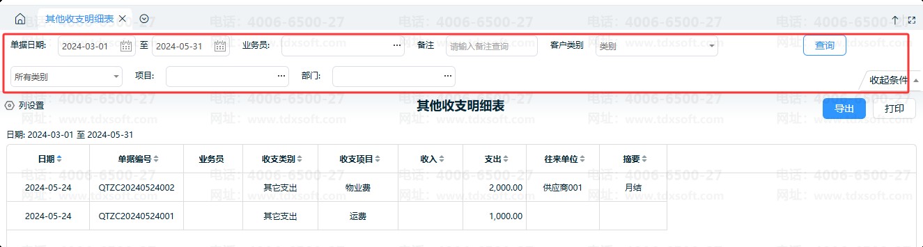③ 其他收入单、其他支出单的明细数据,可在【资金】-【其他收支明细表】及【利润表】中查询。