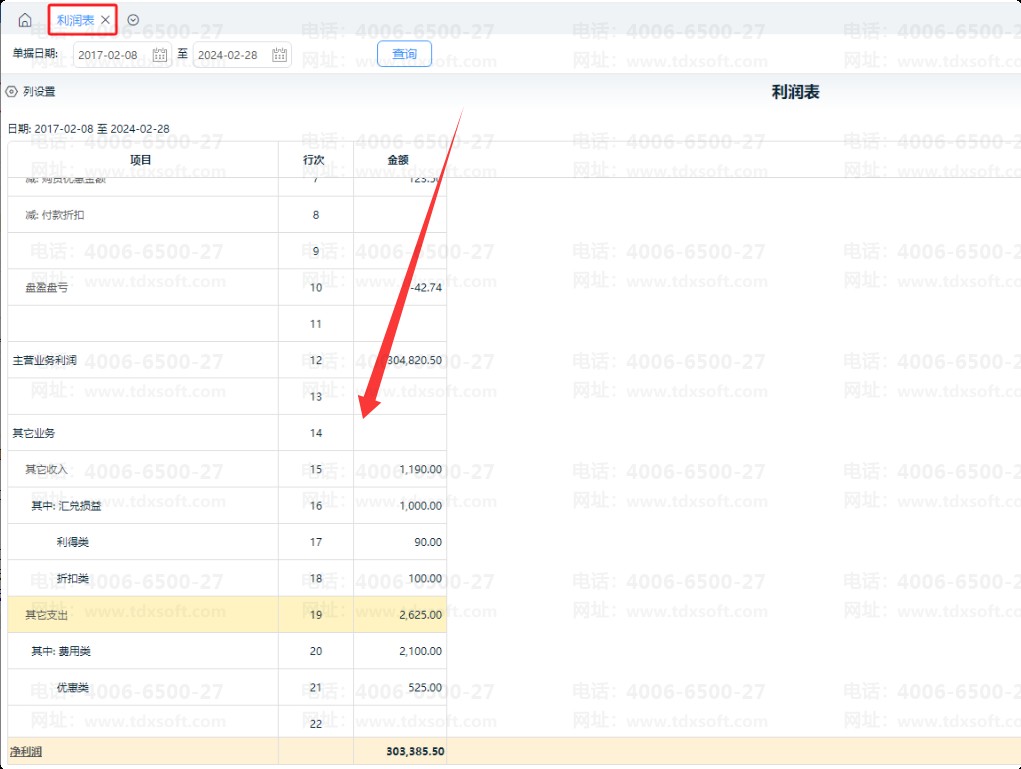 2、其他支出单是支付非购销业务产生的款项行为,如支付定金/押金、支付员工工资、水电费等可以通过其他支出单反应资金的变化等。体现在【资金】-【利润表】的“其他业务”、“其他支出”行,如图: