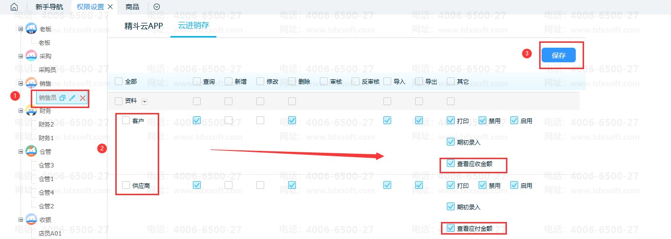 在【资料】,分别勾选【客户-查看应收余额】,或是【供应商-查看应付余额】,分配往来金额查看权限。